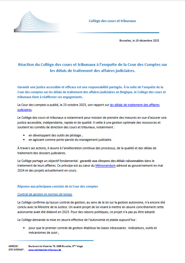 Garantir une justice accessible et efficace est une responsabilité partagée. À la suite de l’enquête de la Cour des comptes sur les délais de traitement des affaires judiciaires en Belgique, le Collège des cours et tribunaux tient à réaffirmer ses engagements.